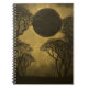 Grungy and cool Dark Forest Eclipse Notebook in gold featuring a quiet forest scene with a lunar eclipse. This digital art notebook would be great for your poetry writing or other note keeping. Customize with your own text.