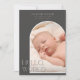 This elegant vertical photo birth announcement features a modern arch shaped photo frame and darker neutral colour palette tones. The phrase, "Hello, World" shares your joy along with classic typography details. The back side features a lighter tone colour with space for a horizontal photo and family message.