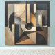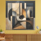 Geometric abstract art with triangles in shades of grey, black, and a touch of gold. Visible brushstroke texture brings depth and drama. Ideal for modern and sophisticated decor. Impactful design evoking cubism with a contemporary and mysterious palette.