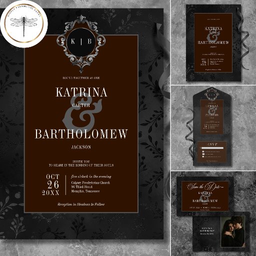 Dark Gothic Black Floral Satin Damask Brown Photo Save The Date