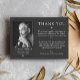 Minimalist and clean thank you card for a memorial service featuring white text against a plain dark gray background, tasteful fonts, and a photo of your loved one.
