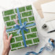 This wrapping paper design features a brick-like pattern with a style inspired by that of classic 8-bit computer games. It features various shades of dark green. Wrapping paper like this might be a fun way to wrap gifts being given to somebody who likes to play vintage computer games.
