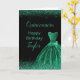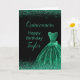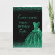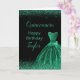 A beautiful dark green themed elegant watercolor dress gown on a black background with faux glitter at the top and bottom of the card.