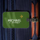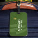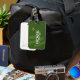A nice luggage tag personalized with the name of the traveller on a dark green background