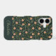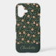 Modern and elegant iPhone case design featuring pattern that has hand painted watercolor small pink flowers and green foliage on a dark green background. Can be personalized with a name.