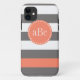 Dark grey and white stripes with a coral circle and space for a monogram.