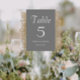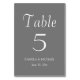 Guide your wedding reception guests to their table with this simple style table number card that features white, stylized lettering on a trendy, dark grey colour background. Design is on each side of card. Edit your card to change table number, wedding couple's names and date. Order cards separately for each table number.