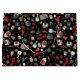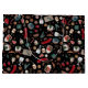 hygge christmas seamless pattern with cute and cozy christmas items on a black background. dark xmas wrapping paper with hand drawn pine trees, santa's socks, mittens, holiday candles, cookies, presents, candy canes, cinnamon, cloves, hot drink, homemade chocolate candies, apples, oranges. winter holiday repeating pattern.