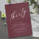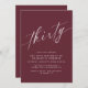Modern 30th birthday invitations with a simple, text-only design. Calligraphy font on a dark red background.