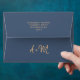 Editable text wedding navy blue envelope featuring a stone marble like pattern liner and bride'a and groom's names initials on the back side. Insert your names letters and your address! Ideal for a trendy modern typography elegant indoor wedding. Matching stationery available.