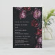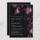 This elegant dark moody floral wedding invitation features purple and red peony flowers on a black background. Dark romantic aesthetic wedding invitation.