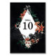 This table number card is perfect for those looking for something truly unique and unforgettable. The design blends elegance with a dark, enchanting atmosphere, featuring a white diamond frame that boldly showcases the table number. Surrounding it is a lush arrangement of deep green foliage and striking flowers in shades of burnt orange, cream, and black. Delicate cobweb details and a subtle skull element add a hint of mystery and sophistication, making this card ideal for gothic, Halloween-inspired, or unconventional events. It's a standout piece that will bring a memorable and dramatic touch to your special occasion.