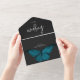 AVAILABLE WITH A QR CODE OR WITH OR WITHOUT DINNER CHOICE OPTIONS. This wedding invitation design features a dark, moody theme that is simple, yet stunning. A dark charcoal black background is the perfect canvas for a single teal blue moth, its wings spread for flight. Unique and elegant, this design can be used for any season. Created by Simply Farmhouse Press.