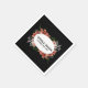 This personalized wedding napkin features a striking, elegant design perfect for adding a touch of romance to your wedding decor. The black background is adorned with a beautiful floral wreath in shades of coral, white, and green, creating a bold and sophisticated look.