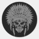 This black and grey skull design is equipped with a large feathered headdress. Swirls and drops decorate the bone in the tradition of the Day of the Dead sugar skulls. Two feathers hang down from the sides of the headband creating a dark symmetrical pattern. This native inspired sugar skull sits on a pure black background creating an aggressive and stylish sticker design.