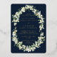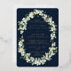A dark navy reception only wedding invitation, featuring hand painted snowberries and stems of eucalyptus arranged into a beautiful botanical frame. The text and scattered dots on the front of the card are foil pressed. All text is fully editable. Please view this Collection in my store for invitations with alternative wording options, different colours and for coordinating items.
