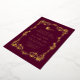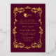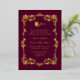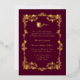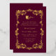 Ornate gold foil wedding invitation done in a dark orchid pink with gold rose vines framing the text area and a single long stem rose at the top of the text area. Personalize the foil text to suit your wedding needs.