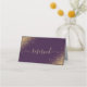 This elegant, modern wedding table reserved seating place card features gold glitter in opposite corners. The word "reserved" appears in gold handwriting script with swashes before and after on dark purple background on both sides of the card.