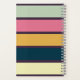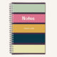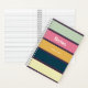 A colourful striped notebook with a dark purple background and text that reads "NOTES" and a custom monogrammed full name.
