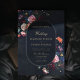 A gorgeous floral arrangement frames this stunning wedding invitation with a dark romantic theme. A dark navy background and rounded rectangle frame are the background for classic typography and touches of elegant calligraphy in a gold hue (digital effect, not real gold). A perfect choice for couples who love the dark romance wedding vibe. A dark and moody wedding invitation that infuses plenty of colour and gives a wide range of colour choices to match a black wedding gown or a dark blue wedding. Elegant and romantic, this is a modern classic wedding invitation.