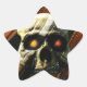 Evil skull with glowing eye sockets and a dark background spattered with streaks of orange, maroon, and black. Happy Halloween, mortals.