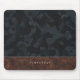 Rugged and masculine camouflage pattern and faux leather personalized name mouse pad. The design features a dark slate grey camouflage pattern paired with brown faux stitched leather to create a stylish rugged look. Personalize with name. Camouflage artwork by Moodthology.