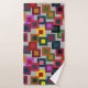 This towel set has a green washcloth, an eggplant coloured hand towel, and a bath towel with a geometric design of squares inside squares in brown, black, brick, yellow, teal, green, purple, gold, pink, red, grey on a field of lighter grey.