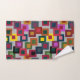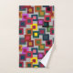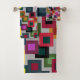 This towel set has a geometric design of squares inside squares in brown, black, brick, yellow, teal, green, purple, gold, pink, red, grey on a field of lighter grey.