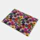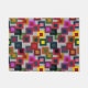 This doormat has a geometric design of squares inside squares in brown, black, brick, yellow, teal, green, purple, gold, pink, red, grey on a field of lighter grey.