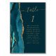 The left-hand edge of this elegant modern wedding table number card features a teal watercolor agate border trimmed with faux gold glitter. The word "table" appears in gold-coloured handwriting script on a dark teal background. Add the names of your guests who are assigned to each table.