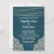 Add a touch of bohemian charm to your wedding invitations with this rustic and whimsical Dark Teal Rustic Elegance Wedding Invitation. The dark teal wooden background sets the stage for a magical celebration, adorned with glowing string lights that create a romantic atmosphere. Delicate white floral lace patterns frame the corners of the invitation, adding an elegant and feminine touch. The combination of a vintage script font and a legible serif font in white creates a beautiful contrast against the dark background, ensuring that all the details are easily readable. This invitation is perfect for couples seeking a unique and enchanting wedding theme. Set the tone for your special day with our Rustic Elegance Wedding invitations that will leave a lasting impression on your guests.