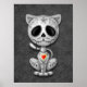 This adorable grey kitten design is decorated with swirls and dot patterns. Small flower pedals circle the pure black eyes in the tradition of the Day of the Dead sugar skulls. The cat is sitting down, looking forward with its tail waving in the background. The over sized head sits on a tiny body which creates a playful, cartoon like appearance. A five point star sits in the middle of the kitten’s forehead while a bright red and yellow heart appears in the centre of the chest. This cute little cat is a fun and stylish design inspired by the beautiful patterns of Day of the Dead sugar skulls.