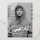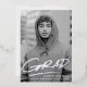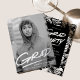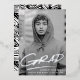 Modern graduation party invitation featuring the graduate's vertical photo with "Grad" in real silver foil handwritten lettering with a dash below. Personalize the trendy photo graduation party invite by adding the graduate's name and school name. The silver foil graduation party invitation reverses to display your party details with a black and white dashed brushstroke background.