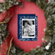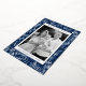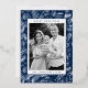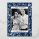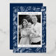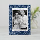 Modern holiday card featuring your photo framed in white with a navy and silver foil dashed geometric pattern. Personalize the foil holiday card with your custom greeting, family name, and year in bold navy lettering. The unique Christmas card reverses to display your custom message in white lettering with a navy background.