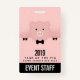 Name badge for a Chinese New Year event. A big pink pig face wearing a formal bow tie. Lifted up by his black cloven hooves and peering over a at you. Cute and whimsical drawing. Set on a pink background with faded hearts. Ready to celebrate the year of the pig 2019.