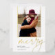 A modern and elegant holiday card featuring a vertical or portrait-oriented photo accented with gold foil trim. "Merry" appears beneath in casual hand lettered gold foil script typography. Personalize with your custom holiday greeting, family name, and the year. A chic and modern minimalist choice for your Christmas 2022 cards.