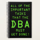This fun DBA themed planner features the message "ALL OF THE IMPORTANT TASKS THAT THE DBA MUST GET DONE!" on the front in a bright green colour digital-inspired font. It could be a fun gift for a busy professional database administrator who has lots of tasks to deal with.
