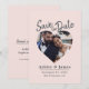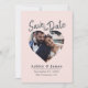 Carte de rendez-vous "Save the Date" à l'écriture moderne avec photo rose blush mettant en vedette une photo centrée en forme de cœur, un fond rose blush doux et un titre en écriture grise. Ce design met en valeur votre photo de fiançailles tout en présentant clairement les noms, la date et le lieu dans une mise en page chaleureuse et équilibrée qui se sent à la fois romantique et moderne. Idéal pour les mariages, les célébrations de fiançailles, les événements de destination ou les renouvellements de vœux où une annonce imprimée classique est souhaitée. Personnalisez facilement avec vos détails.