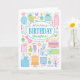 Cakes, presents, balloon, flowers, and party hats fill this birthday card for daughter and also form the bottom border on the inside of the card. A bright pastel feminine birthday card for your daughter full of every thing birthday and party related for her.