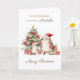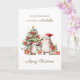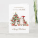 This design features a watercolor illustration of joyful hedgehogs in Santa hat in front of the Christmas tree.