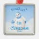 Cheerful little snowman wearing blue winter hat, scarf and mittens as delicate snowflakes fall through the winter sky is a delightful Christmas design for daughter's first Christmas ornament. We specialize in custom-made designs, contact us if you would like a unique 1st Christmas made-to-order layout using this snowman design.