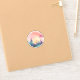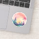 "Dawn's Embrace: Alpine Awakening" is a circular sticker art capturing the serene moment of sunrise in the alpine wilderness. The watercolor effect bathes the pine-covered hills in a soft glow, blending the first light of day with the tranquil tones of dawn. This art piece is perfect for adding a breath of fresh mountain air to any space, ideal for an area of rest and rejuvenation like a spa-themed bathroom or a calm meditation room.