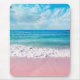 A tropical mousepad with a photo of a seascape with turquoise blue ocean waves, pink sand, and an aqua blue sky.