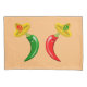 This awesome double sided pillowcase features a pair of chilis, a red chili and a green chili. They both have black eyes and pink mouths. Each Chili is wearing a sombrero hat that has a skull of the opposite colour to the chili on it in celebration of the Mexican Day of the Dead festival, Dia De Los Muertos. The sombrero also contains three flowers with alternating red and green petals representing the flag of Mexico. The design is also tiled on the back so you have 2 looks on one pillowcase.