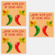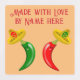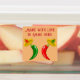 This awesome set of food Favour labels features a pair of chilis, a red chili and a green chili. They both have black eyes and pink mouths. Each Chili is wearing a sombrero hat that has a skull of the opposite colour to the chili on it in celebration of the Mexican Day of the Dead festival, Dia De Los Muertos. The sombrero also contains three flowers with alternating red and green petals representing the flag of Mexico. There is custom text so you can include a message.