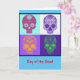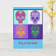 Day of the Dead Mexican festival card, four floral sugar/candy skulls in bright, funky colors. Celebrate family and friends who have passed. This card is blank inside for your own message.