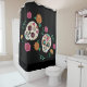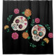 This custom shower curtain has a colourful Dia de los Muertos or Day or the Dead theme on a black background. Two sugar skulls are accented with pink and orange flowers, and floral greenery.