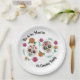 These custom party plates have a colourful Dia de los Muertos or Day or the Dead theme. Two sugar skulls are accented with pink and orange flowers, and floral greenery. A sample family name is printed under the skulls that you can personalize to include your own custom name or text.