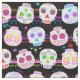Festive, Mexican sugar skulls pattern on customizable fabric for creating your own costume, decor or craft for Day of the Dead. These skulls have lots of brightly coloured details and stand out on a black background colour. You can adjust the pattern size to meet your sewing and crafting needs.