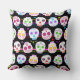 Festive, Mexican sugar skulls pattern on throw pillows for celebrating Day of the Dead. They have lots of brightly coloured details and really stand out on a black background colour. They come in several sizes and you can adjust the pattern size to make it your own unique decor!